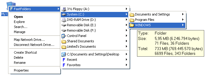 This system extension increases your productivity dramatically by giving you quick and easy access to folder contents and files. Without opening each and every folder, you can browse the directory structure starting at any point by clicking the right mouse button on a file, folder or drive. The program adds a menu item to the context menus of shell objects, which displays the directory structure on demand. If you drag and drop an object on a folder or drive using the right mouse button, you can copy or move the object(s) to any folder of your computer by selecting it from the FastFolders menu. FastFolders also adds a new column to the "Details" view of Explorer windows, which shows the total size of folders including their subfolders and files. This is extremely useful for getting an overview of the distribution of your files and the disk space they occupy. Detailed description »
